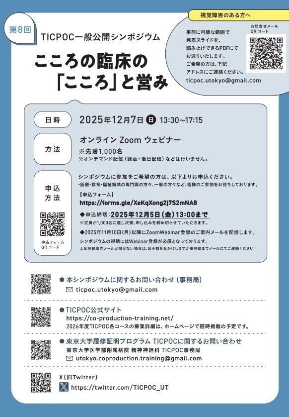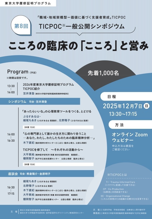 この度、2025年12月7日にて開催される「職域・地域架橋型ー価値に基づく支援者育成」TICPOCの第8回一般公開シンポジウム「こころの臨床の「こころ」と営み」に登壇いたします。