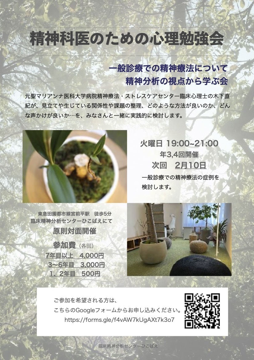 精神科での外来診療や入院診療での精神療法について、精神分析の視点から実践的に学ぶ勉強会です。